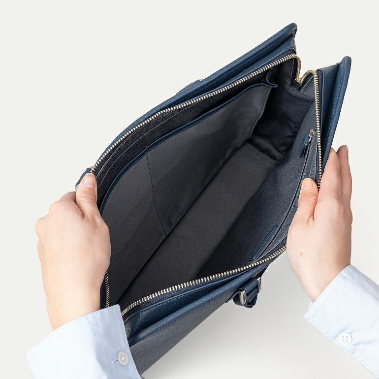 置いた時に自立しますか? はい、自立します。底には4つの底鋲が付いており、しっかりとパイピングされています。そのため、荷物を入れても安定して自立するよう設計されていますので、ビジネスシーンでも安心してお使いいただけます。
