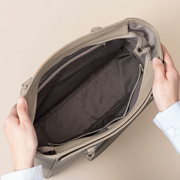 バッグの裏地は何色ですか? バッグの裏地には、バッグ本体と同じ色の布を使用しており、内側まで統一感を大切にしています。コットンとナイロンを組み合わせた高級感のあるシャンタン素材を採用していますので、手触りも滑らかです。