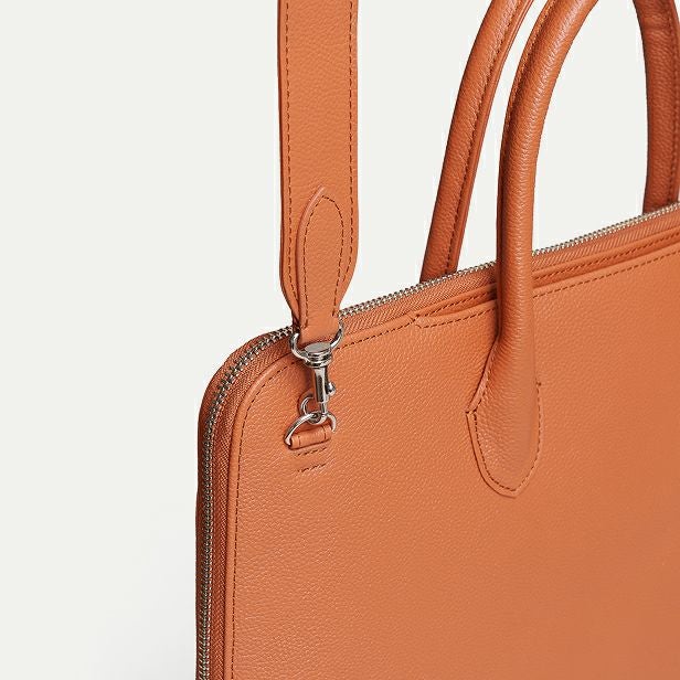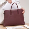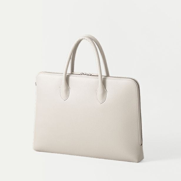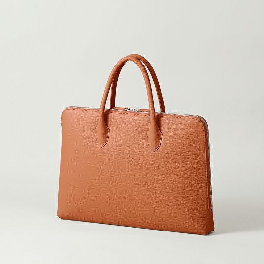 はい、自立する設計です。バッグの美しいシルエットを保つため、持ち手には金具を使わず、倒れないように設計しています。使用しないときも立ったままなので、型崩れしにくく上品な印象です。