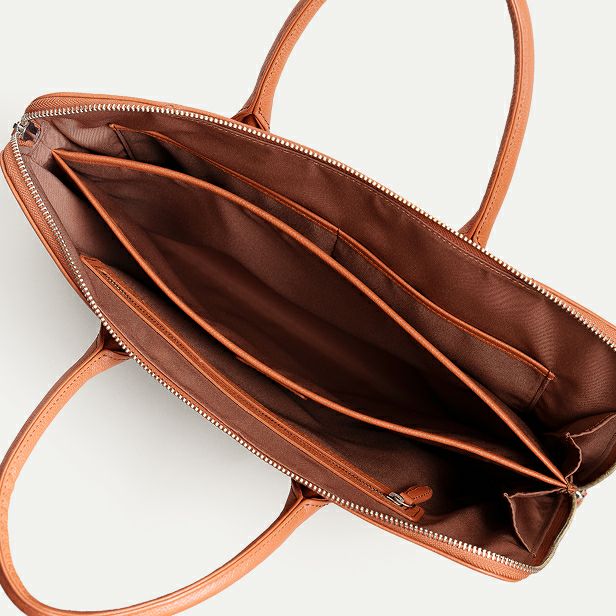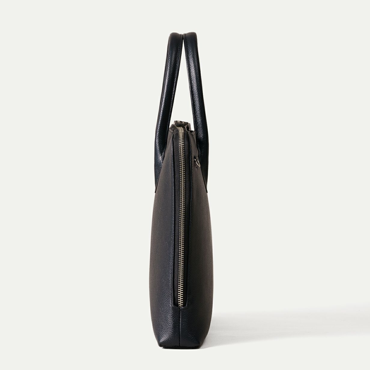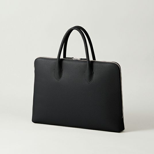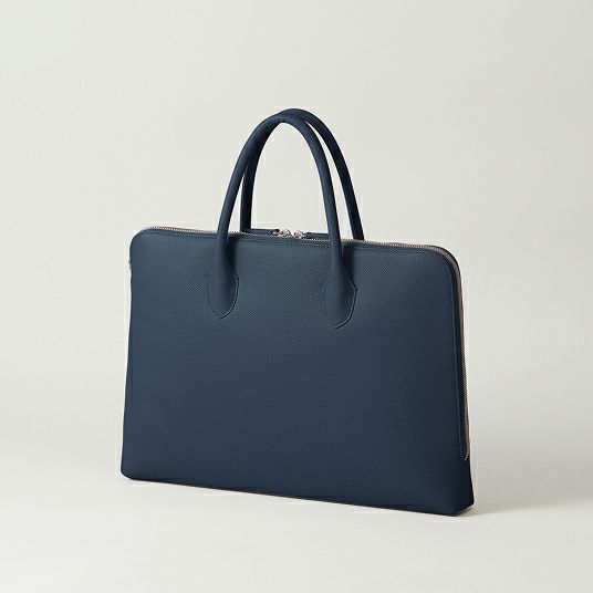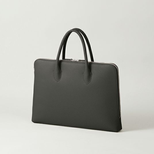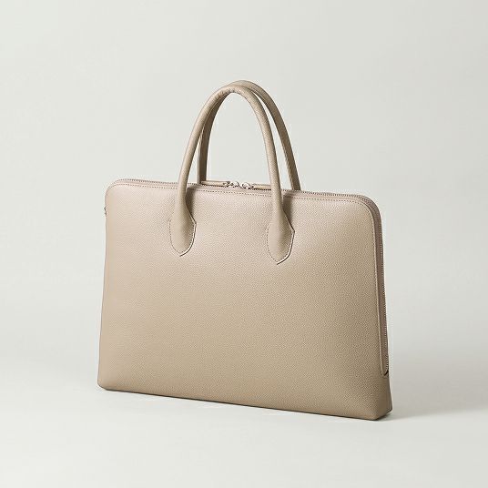 はい、自立する設計です。バッグの美しいシルエットを保つため、持ち手には金具を使わず、倒れないように設計しています。使用しないときも立ったままなので、型崩れしにくく上品な印象です。