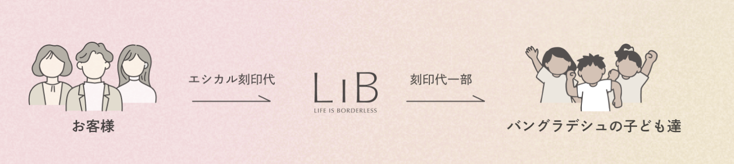 昨年のホリデーシーズンに実施したコラボ刻印に続く第二弾として、今回の刻印の売上の一部は、LIBの自社工場があるバングラデシュの子どもたちの未来につながる取り組みに活用されます。